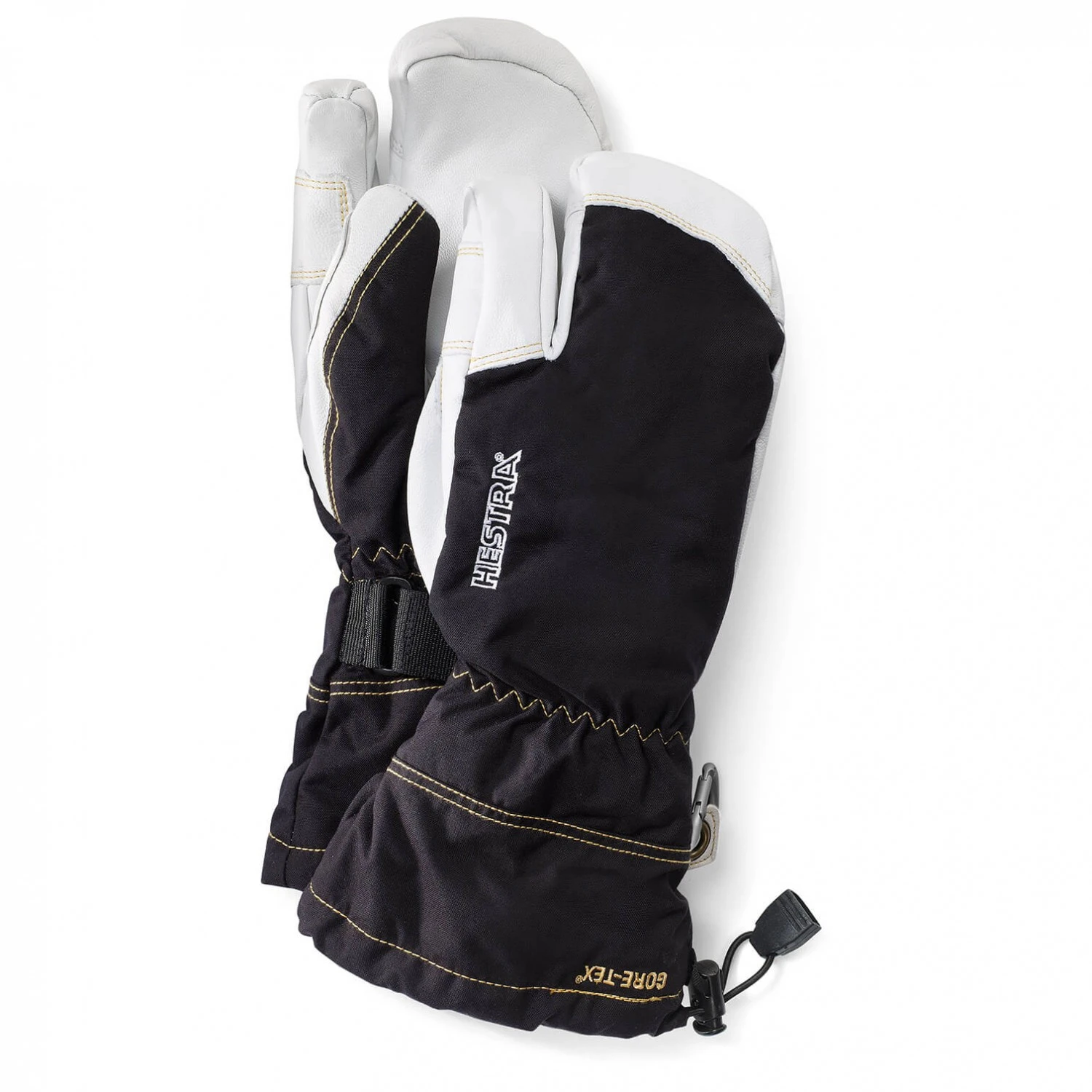 In addition, they feature a synthetic insulation and a soft fleece lining to keep your hands warm and dry. The snow closure with the drawstring prevents powder snow from penetrating. Other great features include the hook-and-loop fastener that ensures a good fit and the carabiner to attach the gloves to a backpack or climbing harness. If you like to spend your days in deep snow, on glaciers or in the vertical on icy days and need very durable gloves, then you should take a closer look at the Hestra Army Leather GTX 3 Finger!